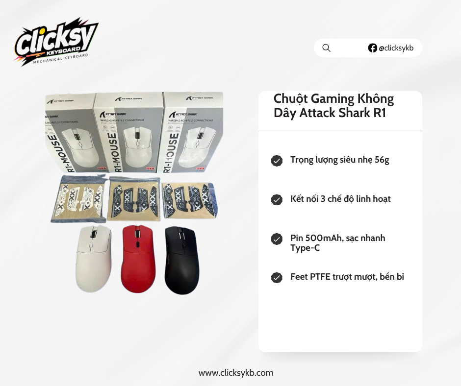 Chuột Gaming Không Dây Attack Shark R1, Pixart 3311, Max 21800 DPI, 3 modes.