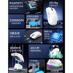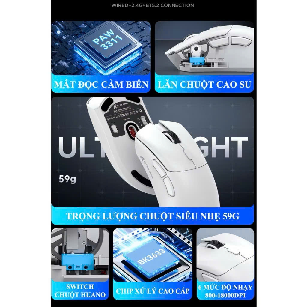 Chuột được trang bị pin dung lượng 300mAh, cung cấp thời gian sử dụng lên tới 65 giờ. Các tính năng như 800-18000 DPI tùy chỉnh, tốc độ phản hồi 1000Hz, và tốc độ di chuyển 400 IPS đảm bảo sự linh hoạt và chính xác trong mọi tình huống chơi game.